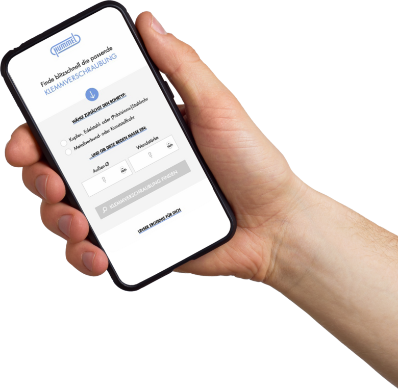 In wenigen Schritten zur richtigen Klemmverschraubung – egal wo, auch direkt vor Ort auf der Baustelle. Smartphone aus der Tasche holen, MKV-App aktivieren, Rohre abmessen, Werte eintragen und das Ergebnis anzeigen lassen. Fertig! Bei Bedarf kann die ermittelte Verschraubung direkt mit allen Produktinformationen per E-Mail weitergeleitet werden – ins Büro zur Angebotserstellung, ins Lager zur Kommissionierung oder ins Abhollager zur Bestellung.
