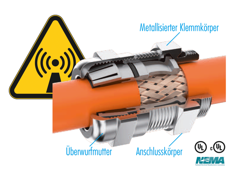 Der metallisierte Klemmkörper sorgt für eine sichere 360⁰-Kontaktierung zum Schirmgeflecht und damit für einen dauerhaften EMV-Schutz auch in dynamischen Anwendungen.