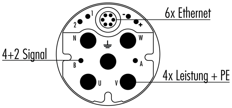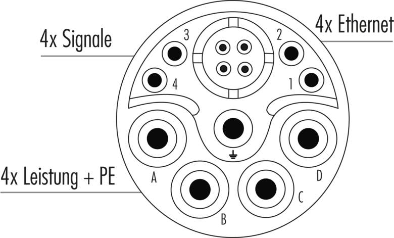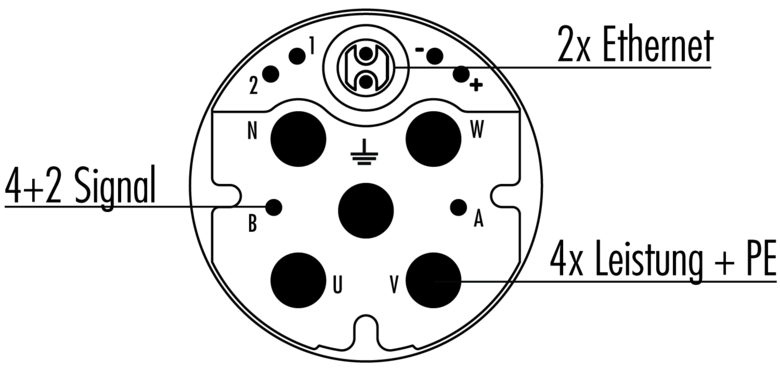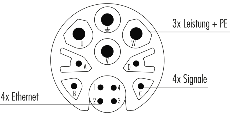 Der M40 Hybrid vereint die Power der Standardbaureihe mit der Vielseitigkeit eines Hybrid-Steckverbinders. Dieser Rundsteckverbinder überträgt Leistung bis zu 55 A und parallel Datenraten bis 100 Mbit/s. Eine Besonderheit sind die hohen elektrischen Kennwerte der zusätzlichen Signalkontakte A/B. Sie ermöglichen Anwendern in der Servo-Technik Übertragungswerte von bis zu 300 V/7 A für Bremsen.